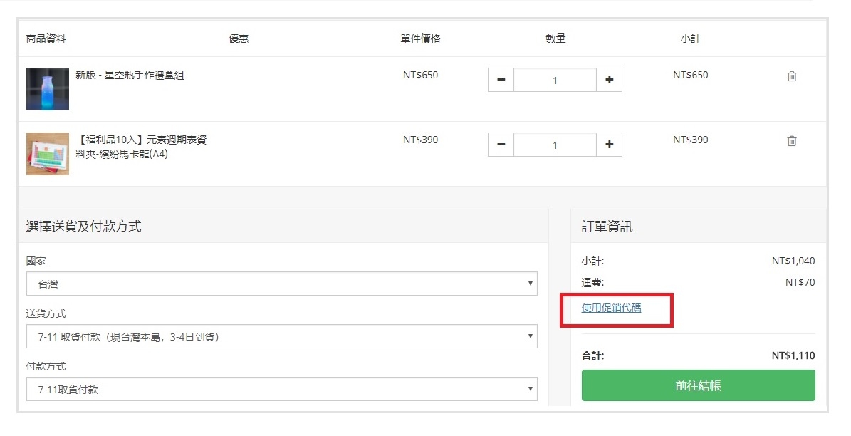 2.記下或複製折扣碼,於LiFe商城購物車結帳時,選取「使用促銷代碼」,如下圖所示,選取之後填入優惠代碼,即可折抵使用。 ※ 優惠碼英文大小寫皆要一致才可折抵喔!