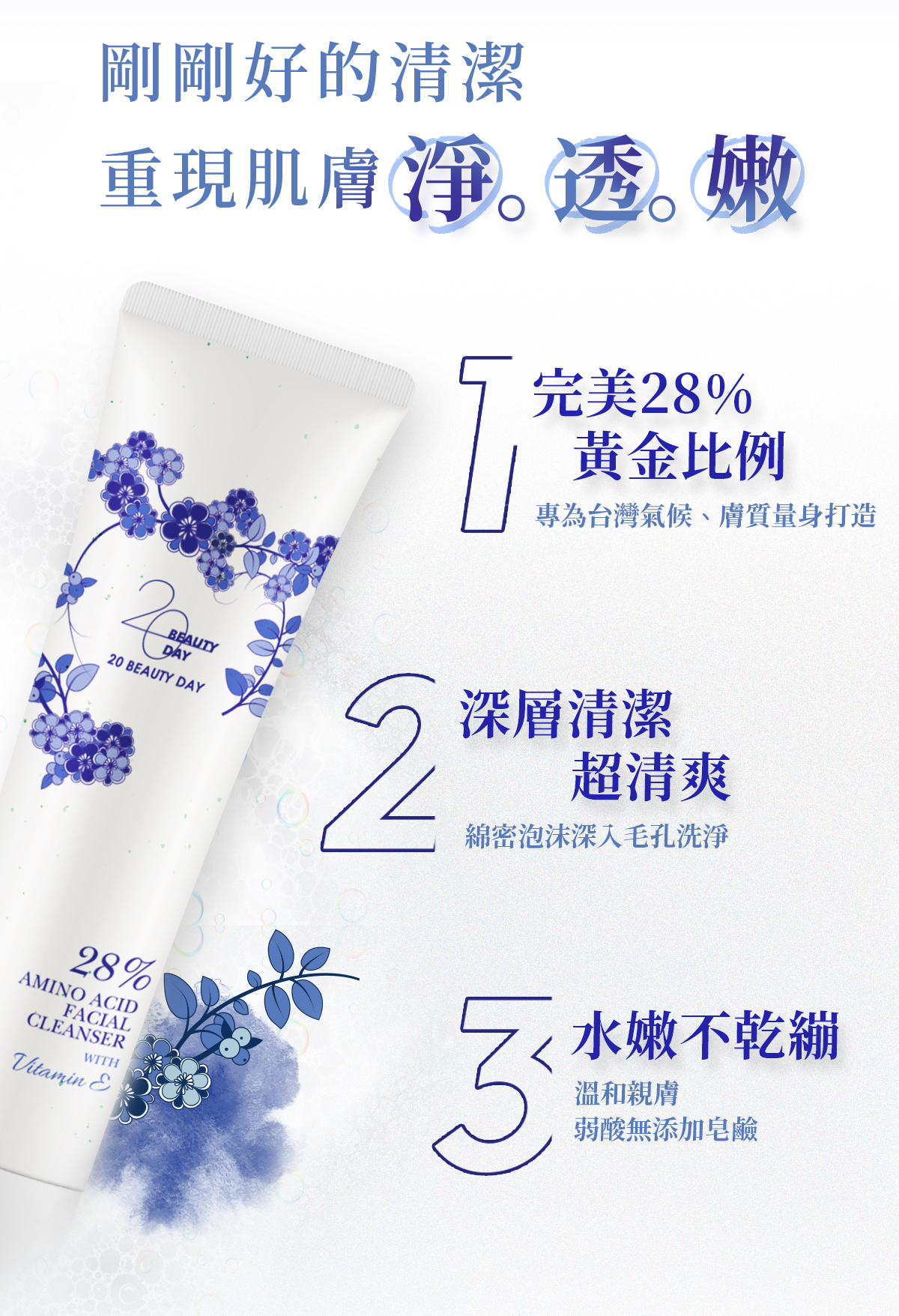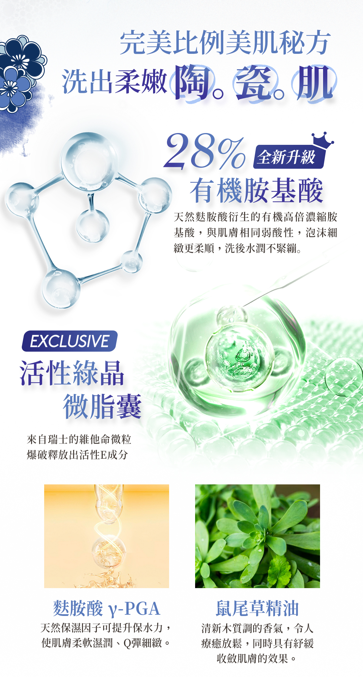 專為台灣氣候與肌膚精研打造,以完美比例的28%胺基酸作為基底,獨家配方嚴選瑞士進口的活性綠晶微脂囊,潔顏時柔緩釋放出活性成分,弱酸性配方不含皂鹼,溫和親膚不刺激,提升肌膚保水力,延緩水分流失並強化肌膚原有保水屏障。