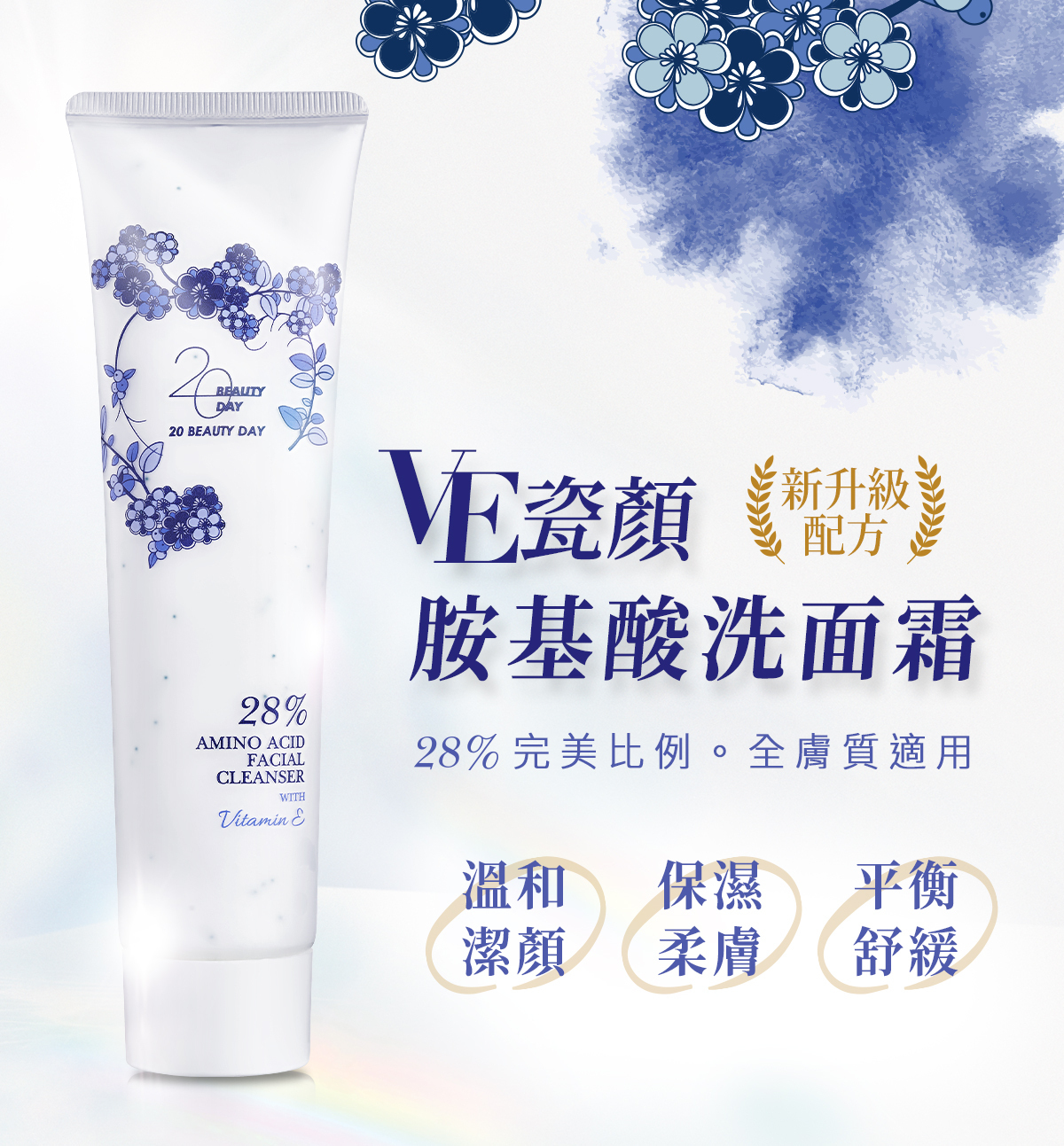 20 Beauty Day「VE瓷顏胺基酸潔顏霜」利用完美比例美肌秘方,讓你輕鬆洗出淨嫩陶瓷肌,在皮脂零負擔的狀態下,維持黃金油水比例,給毛孔真正深呼吸,加承後續保養效果。