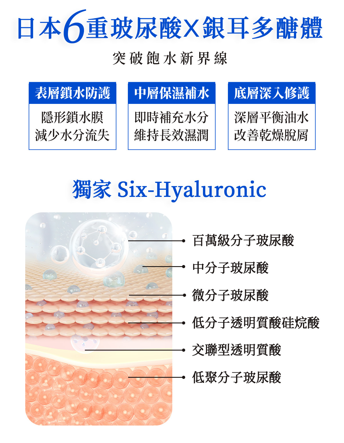 蘊含高濃度藍銅胜肽,迅速修護肌膚,緊實撫紋並延緩老化;獨家六重玻尿酸搭配Q彈活力寡肽、美白九胜肽及膠原三胜肽,加強改善暗沉,給予肌膚充滿活力的的彈力呵護,全方位延緩老化危肌,解緩不適問題,使肌膚更加倍緊緻澎潤,全膚質適用。