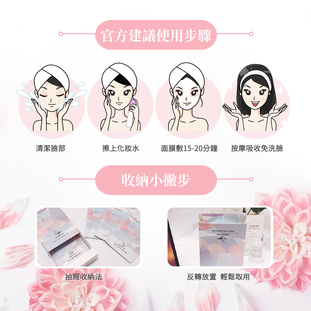 清潔臉部、擦上化妝水後,拿面膜敷15-20分鐘,最後按摩吸收即可