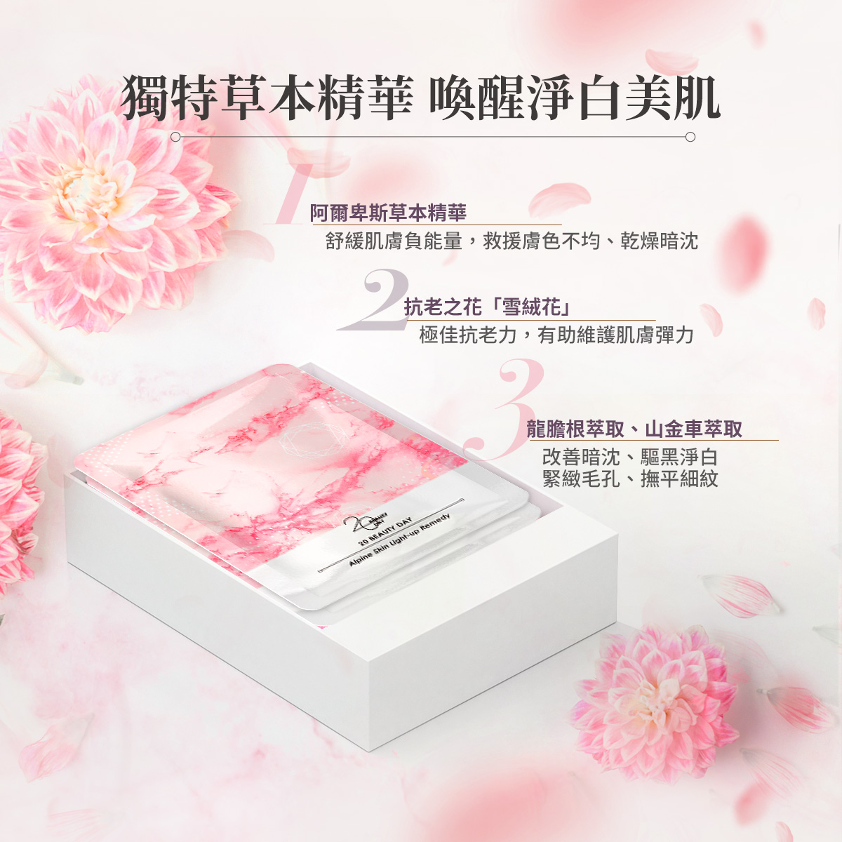 取自阿爾卑斯山潔淨無瑕的植物萃取,藉由大自然復活能量清除積累在肌膚中的負能量,在肌膚出現膚色不均、暗沉的時刻,能夠立即救援,並以乙基維生素C、傳明酸、美白胜肽組合等成分,修護並增加肌膚光澤,瞬間使肌膚明亮光滑。