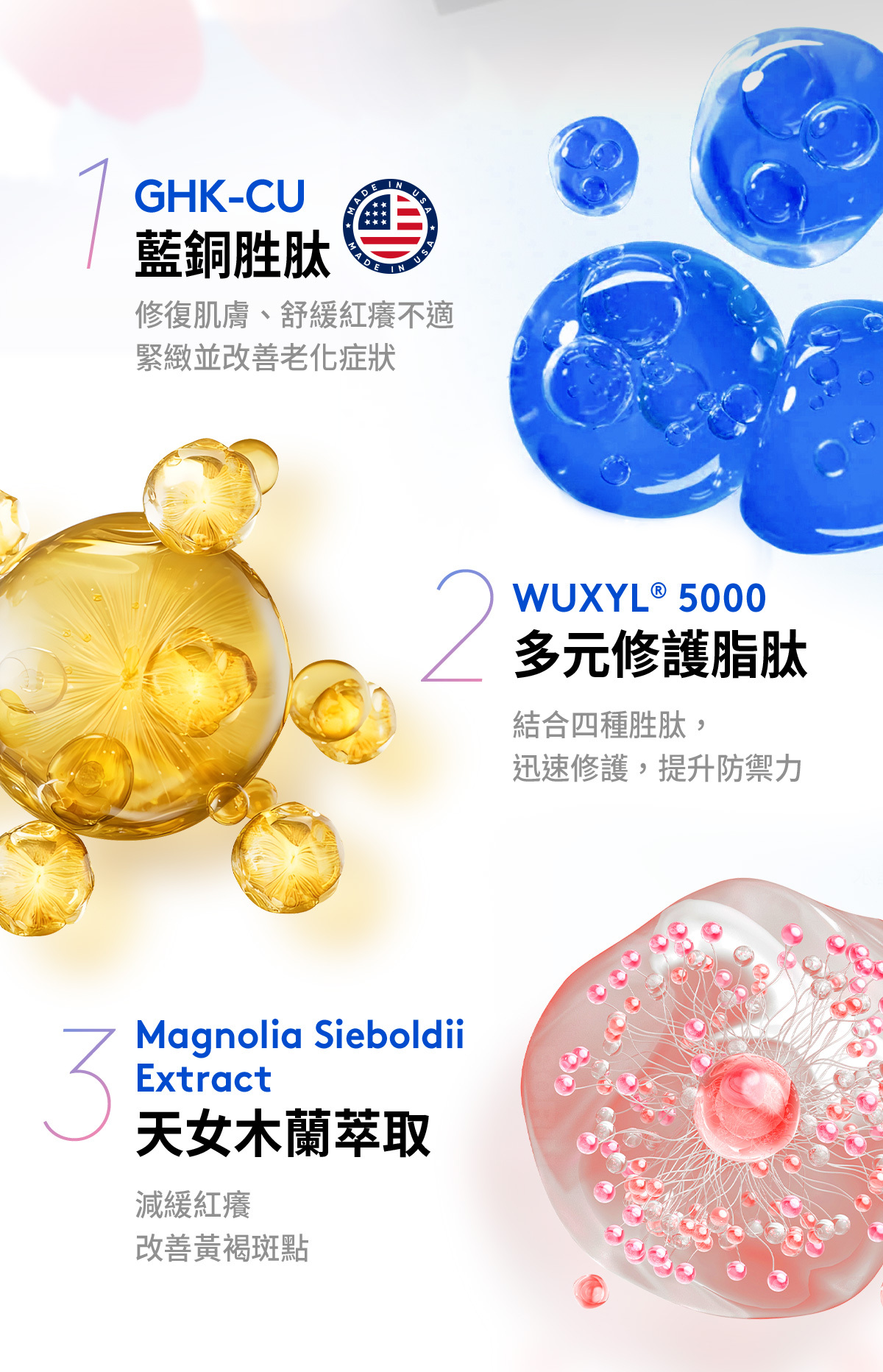 ▍藍銅胜肽 x 天女木蘭萃取 x 多元修護脂肽