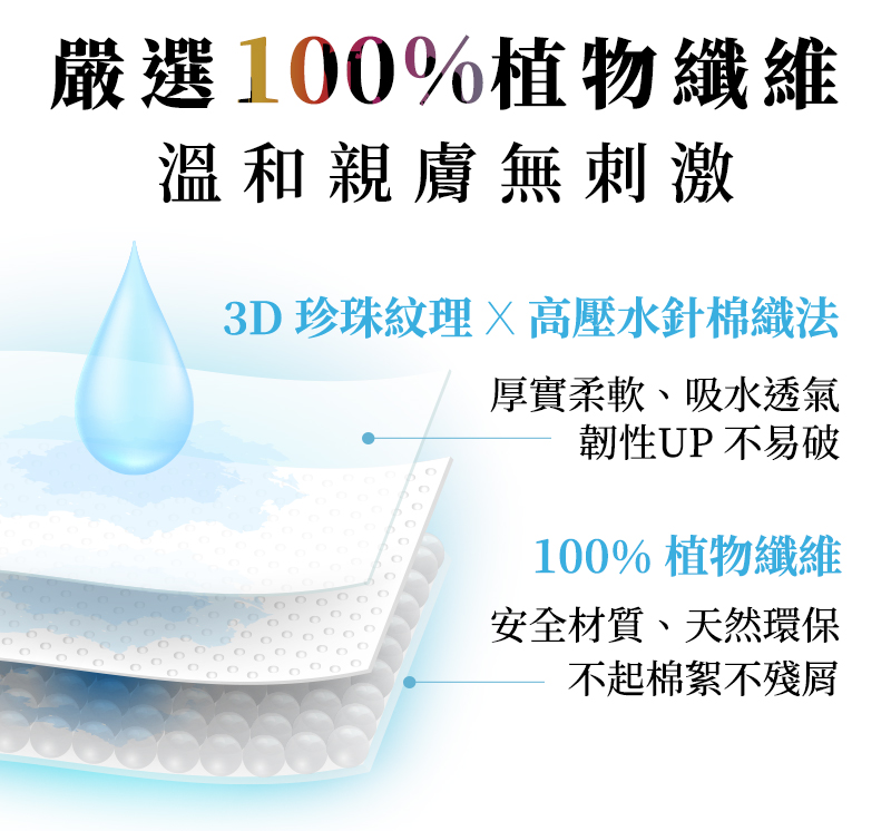 利用高壓水針不織布以珍珠紋交叉鋪棉織法,讓布膜更加柔軟舒適。