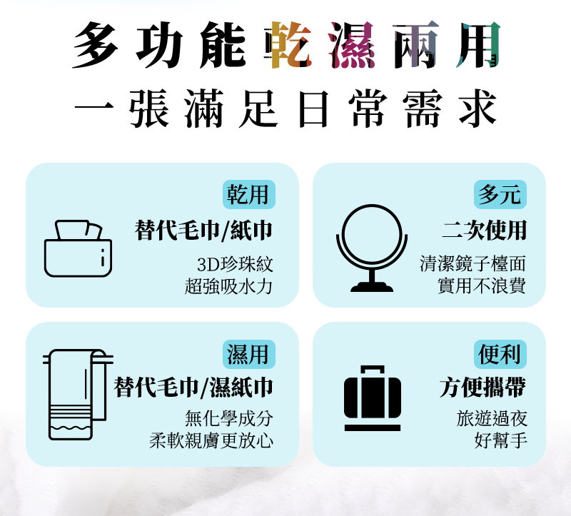 可乾濕兩用,吸水力佳、柔軟親膚;不含任何螢光劑等化學物質,給予肌膚安全零負擔的呵護。