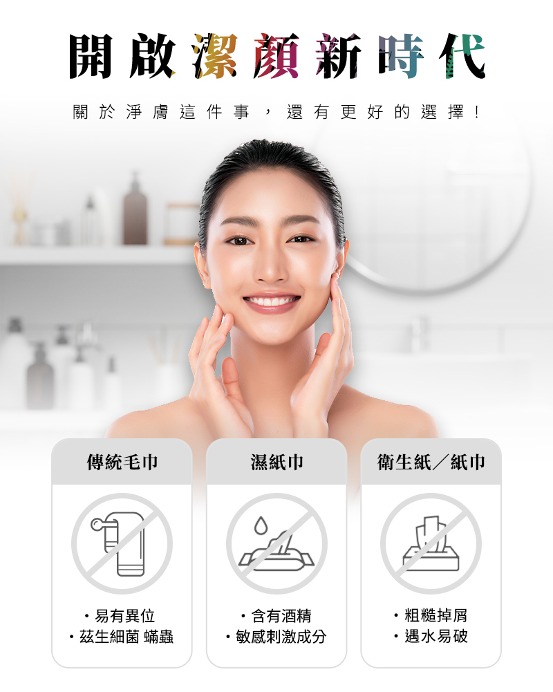 2. 清潔:將洗臉巾充分沾濕後由內而外擦拭臉部去除污垢及老廢角質,可重複一至二次。