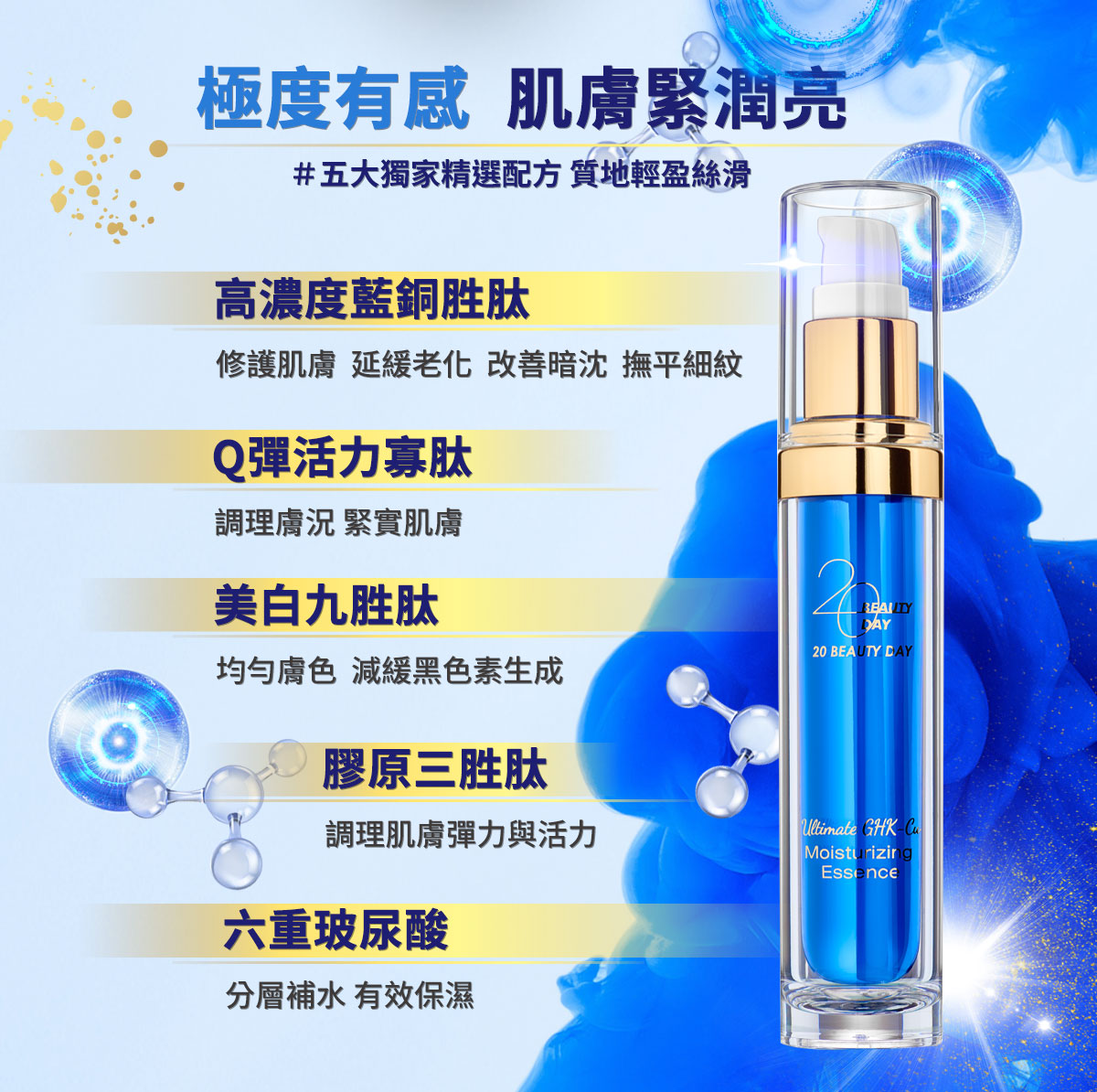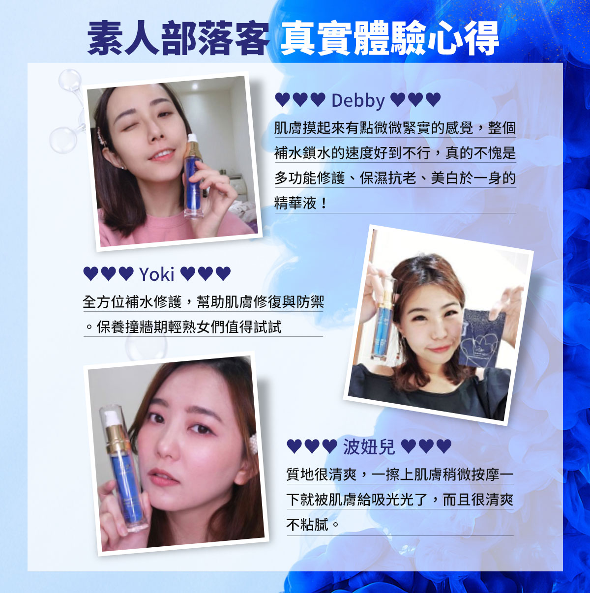 ※精華液:藍銅胜肽水盈超導精萃、玻尿酸保濕原液、靚亮活萃煥顏精華