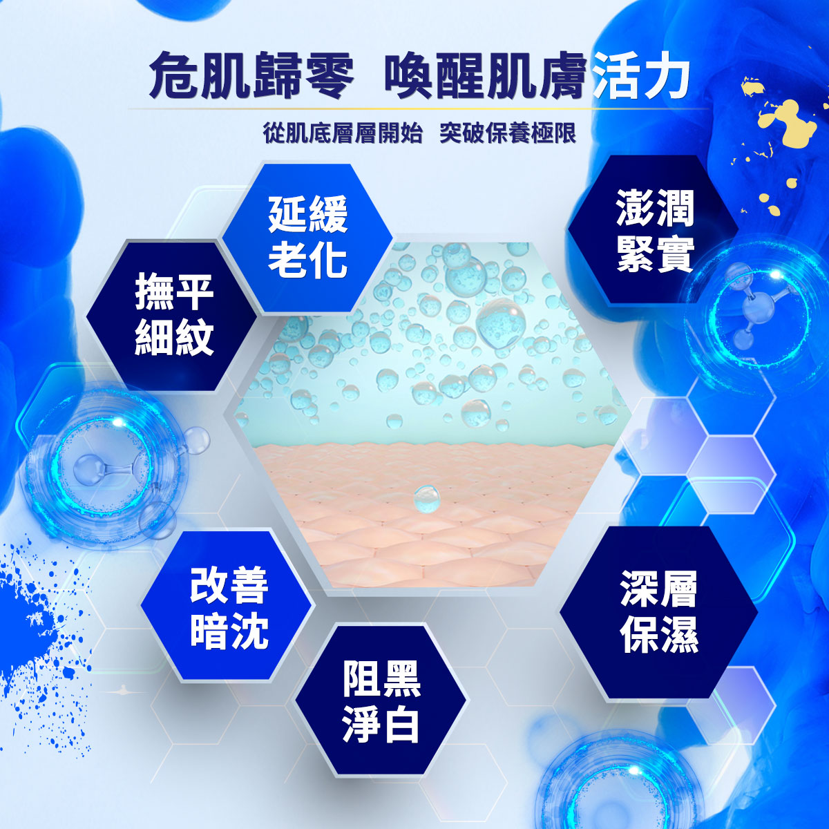 蘊含高濃度藍銅胜肽,迅速修護肌膚,緊實撫紋並延緩老化;獨家六重玻尿酸搭配Q彈活力寡肽、美白九胜肽及膠原三胜肽,加強改善暗沉,給予肌膚充滿活力的的彈力呵護,全方位延緩老化危肌,解緩不適問題,使肌膚更加倍緊緻澎潤,全膚質適用。