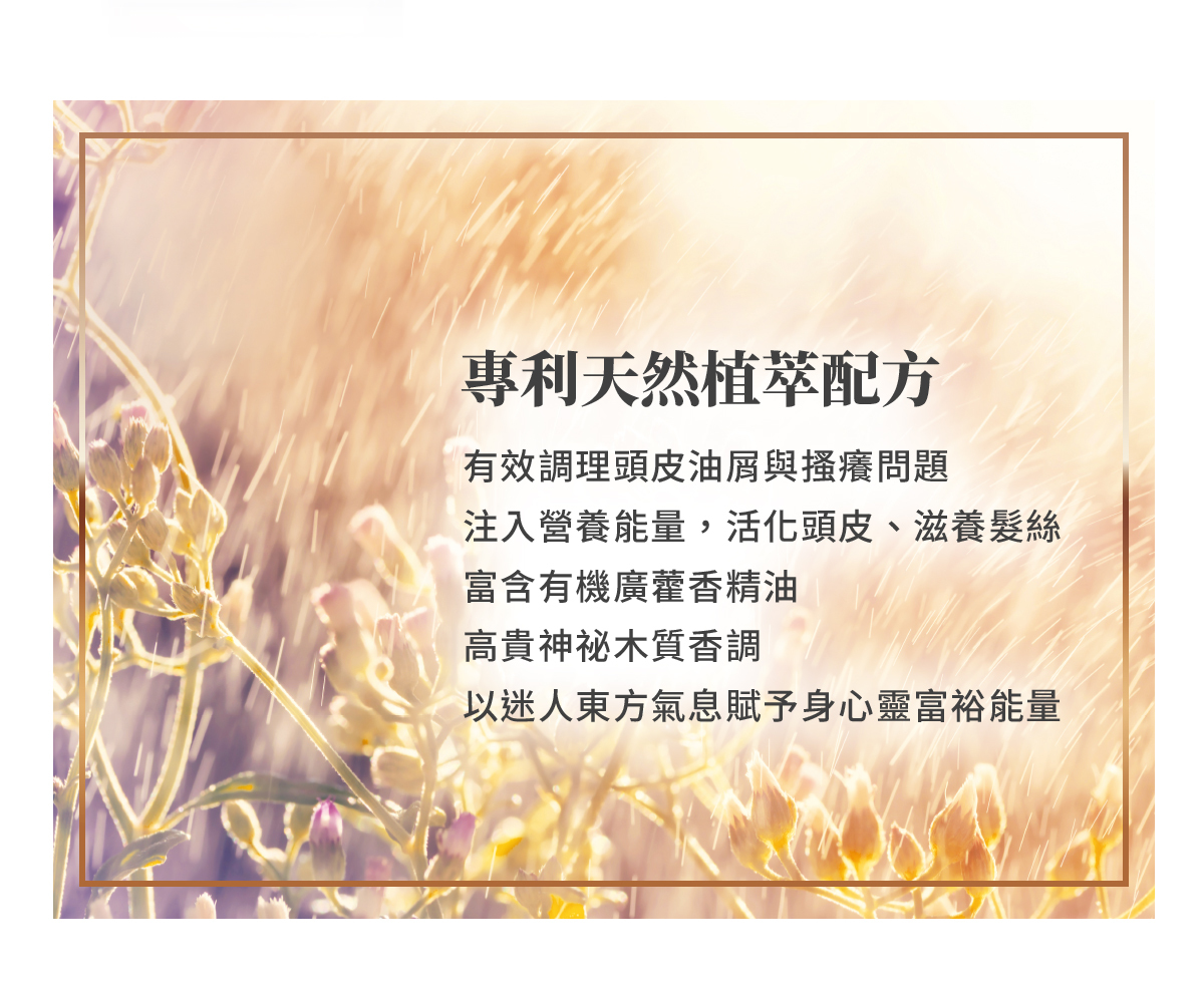 結合天然椰油與專利天然植萃配方,有效調理油屑與搔癢問題;活化頭皮、滋養髮絲效果;富含有機廣藿香精油,帶有高貴神祕木質香調,迷人東方氣息賦予身心靈富裕能量。