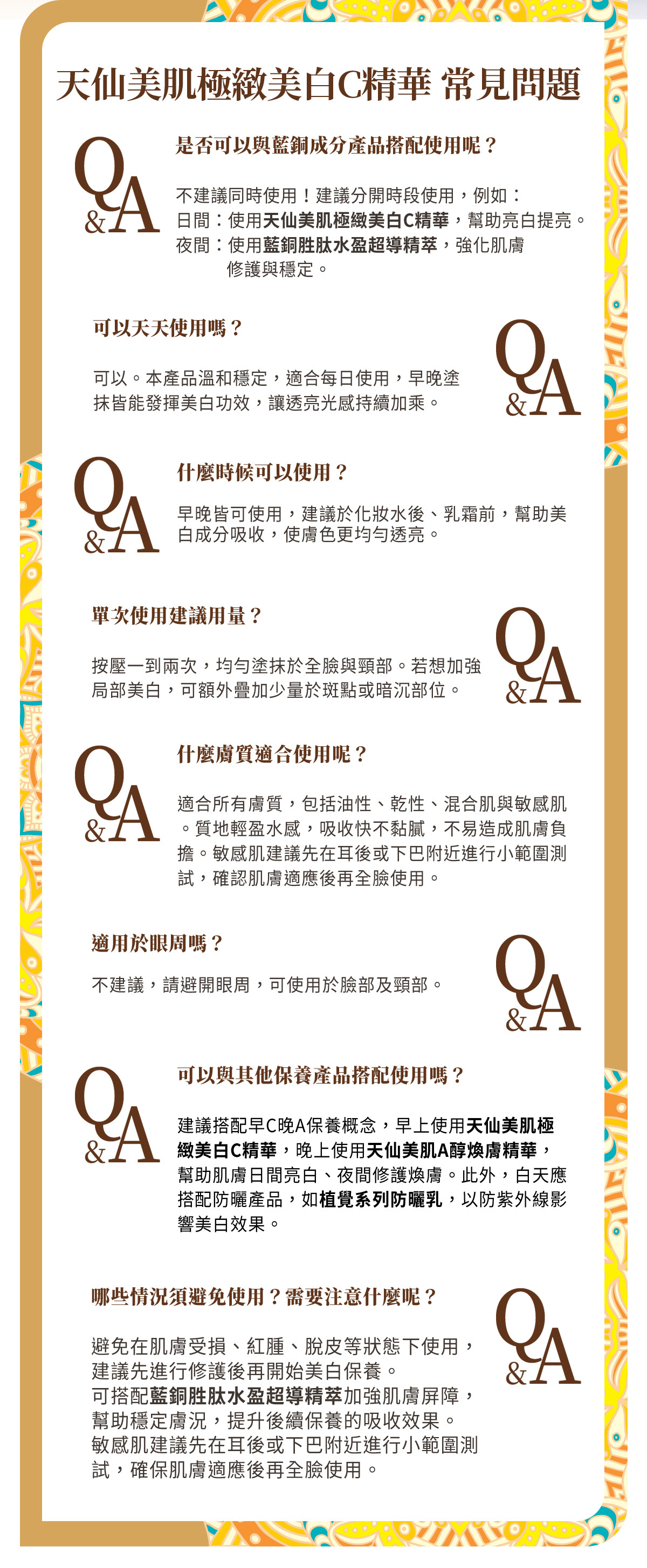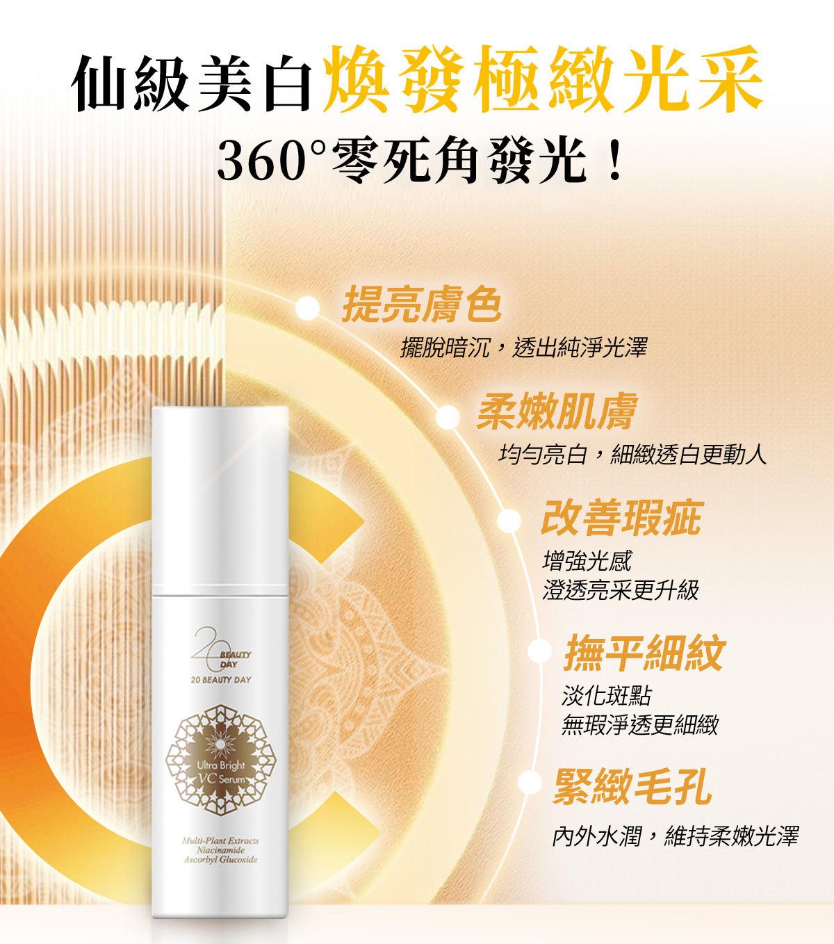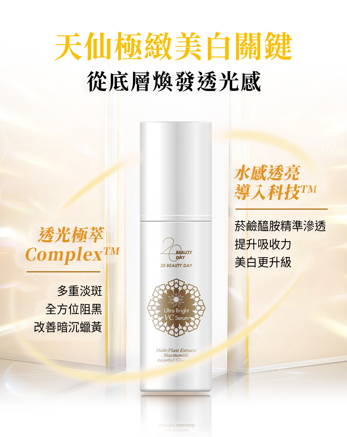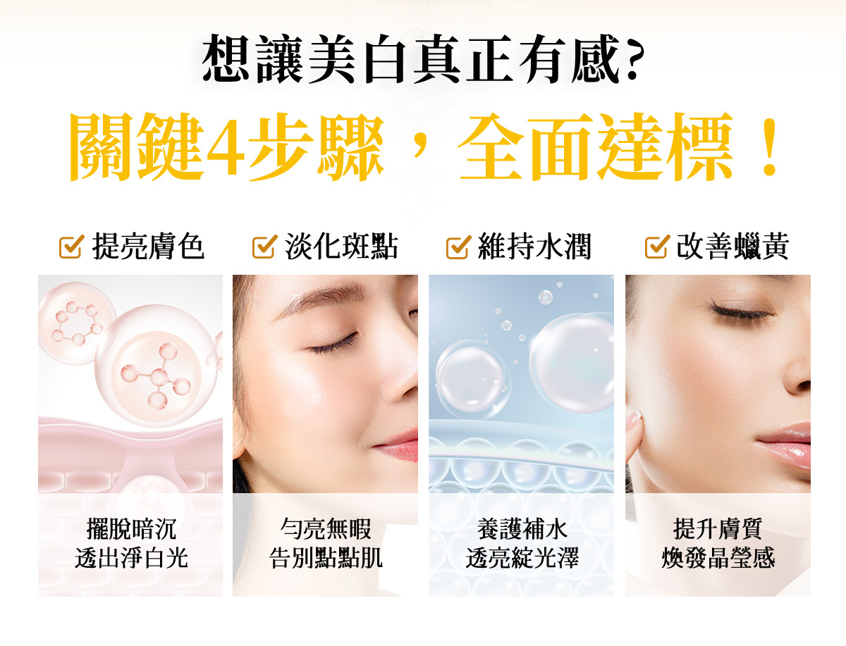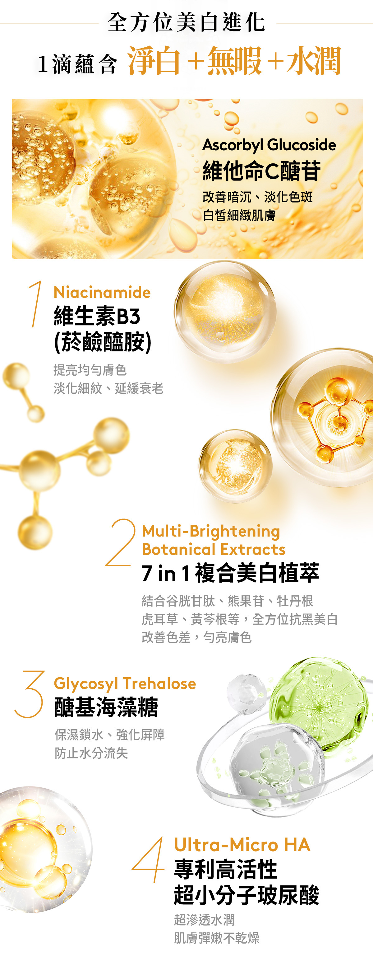 採用透光極萃Complex™,結合高濃度維他命C醣苷與7 in 1複合美白植萃,深入肌底釋放透亮能量,有效改善暗沉,使膚色勻淨透亮;以菸鹼醯胺搭載水感透亮導入科技™,使亮白能量更易吸收,讓肌膚散發自然光澤,綻放勻淨亮白的剔透美肌。