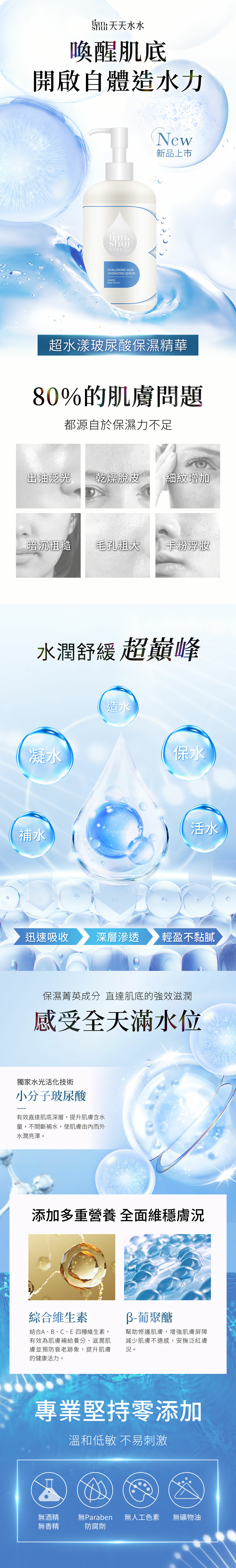 以獨家玻尿酸水光活化技術,精準定位肌膚不同層次需求,協同複合維生素由外而內,層層注入養分並活化儲水保濕層,密集補水,改善乾荒,細緻肌膚,給予肌膚高倍保濕效果,達到長效豐盈的嫩、彈、亮。