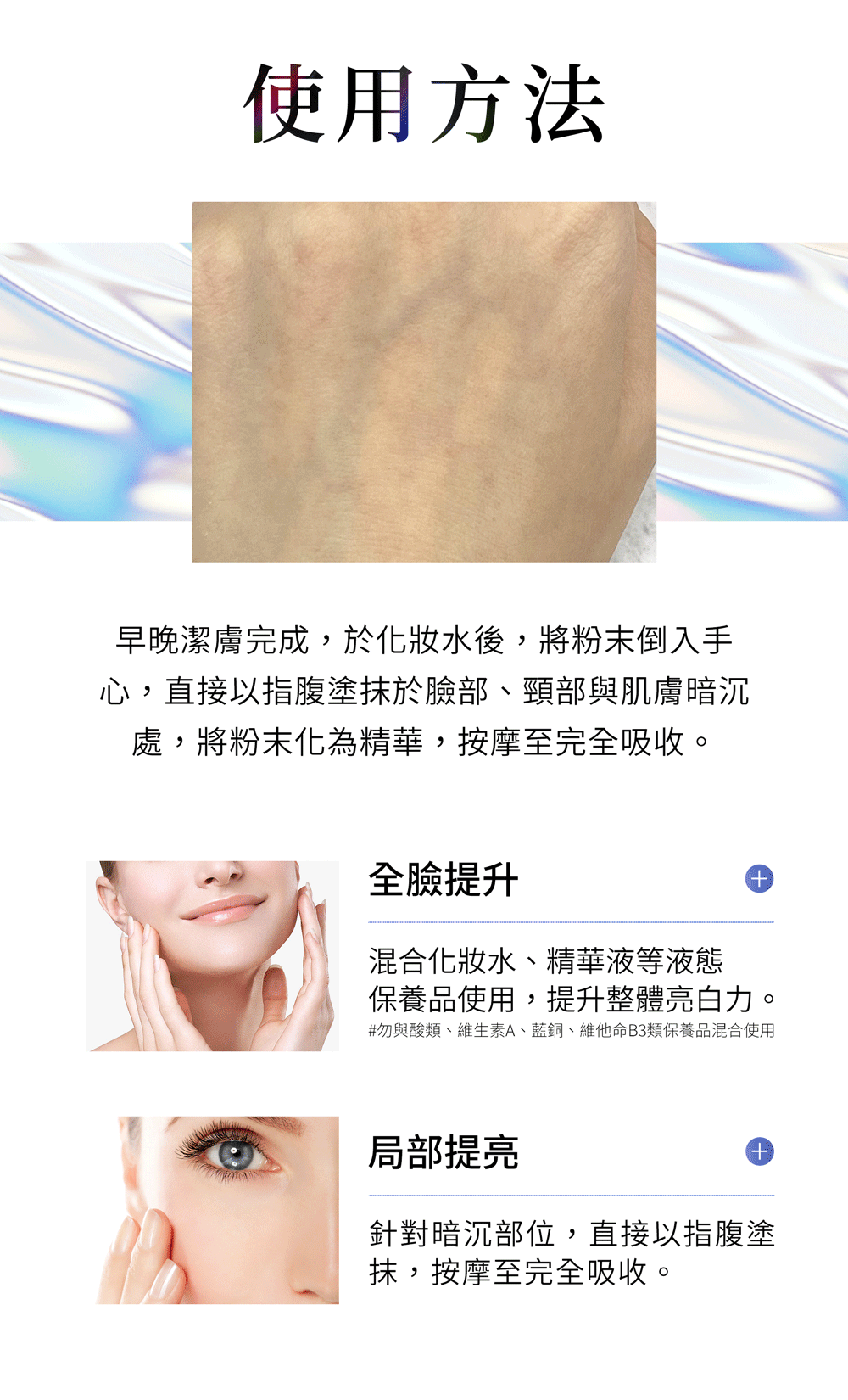 最鮮的維他命C!可直接塗抹的創新科技粉末,一抹化水解鎖「高濃縮維C」活性,最大限度發揮亮白力,搭配「玻尿酸」保濕力更加乘,明亮膚色、 淡化斑點瑕疵,展現淨透亮皮!
