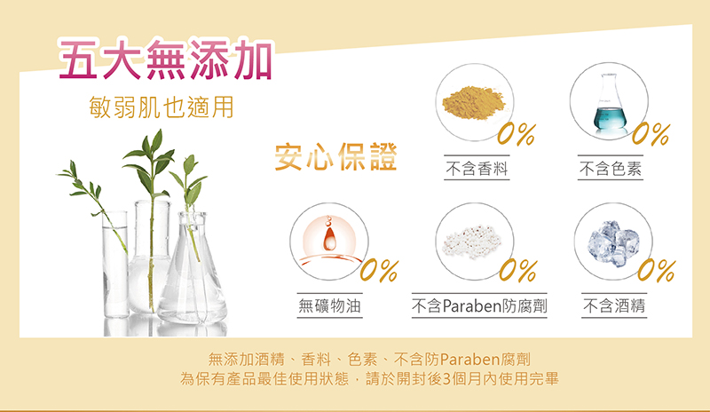 五大無添加,敏弱肌也適用!無酒精、無香料、無色素、無礦物油、無Paraben防腐劑