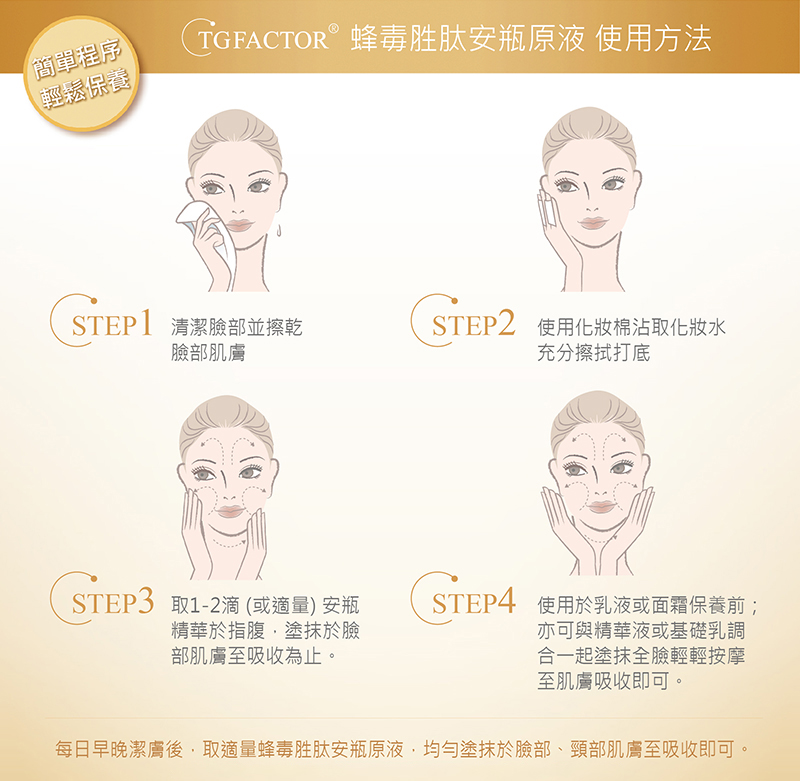每日早晚潔膚完,使用化妝水後,取適量蜂毒胜肽安瓶原液,
