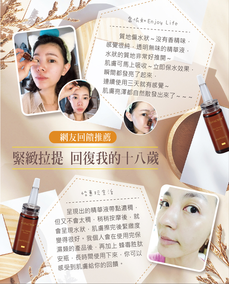 一瓶蜂毒胜肽安瓶原液,搞定6種肌膚歲月痕跡問題,減少乾澀、淨化毛孔、亮白美肌、賦活緊緻、撫平細紋、延緩老化,帶您回返緊緻年輕的肌膚輪廓線條,散發年輕光彩~