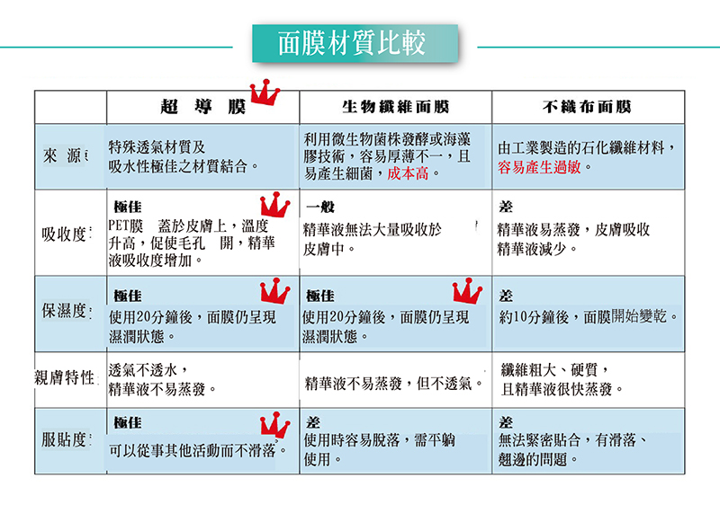 革命性新型面膜材質,能與肌膚更全面性貼合,完美提升肌膚水合效果;使用後,面膜仍保持濕潤狀態,精華液不易蒸發、吸收度更加,使面膜精華成分有效率浸透至底層。
