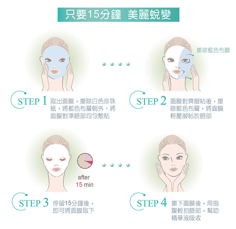 撕除藍色布層,面膜輕壓服貼後,停留15~20分鐘後,