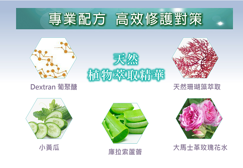 •天然植物萃取精華 - Dextran葡聚醣、小黃瓜、庫拉索蘆薈、天然珊瑚藻萃取、大馬士革玫瑰花水