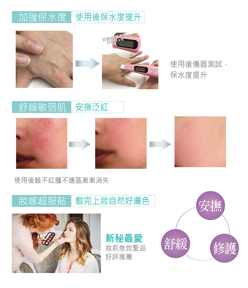 ▍ 所有膚質均適用,特別是肌膚敏感乾燥,需要強力補充水分者。