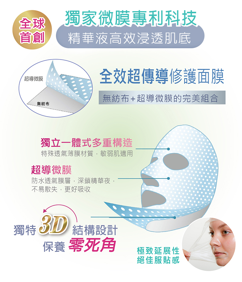 專為術後敏弱肌膚打造的「深層舒緩修護面膜」,使用全球首創獨家微膜專利技術;藉由大氣壓力負原理通過0.2微米外膜上數萬顆細速導孔,精華液吸收度增加!給肌膚最極致的保濕、修護、舒緩,讓你由內而外重現健康光澤!