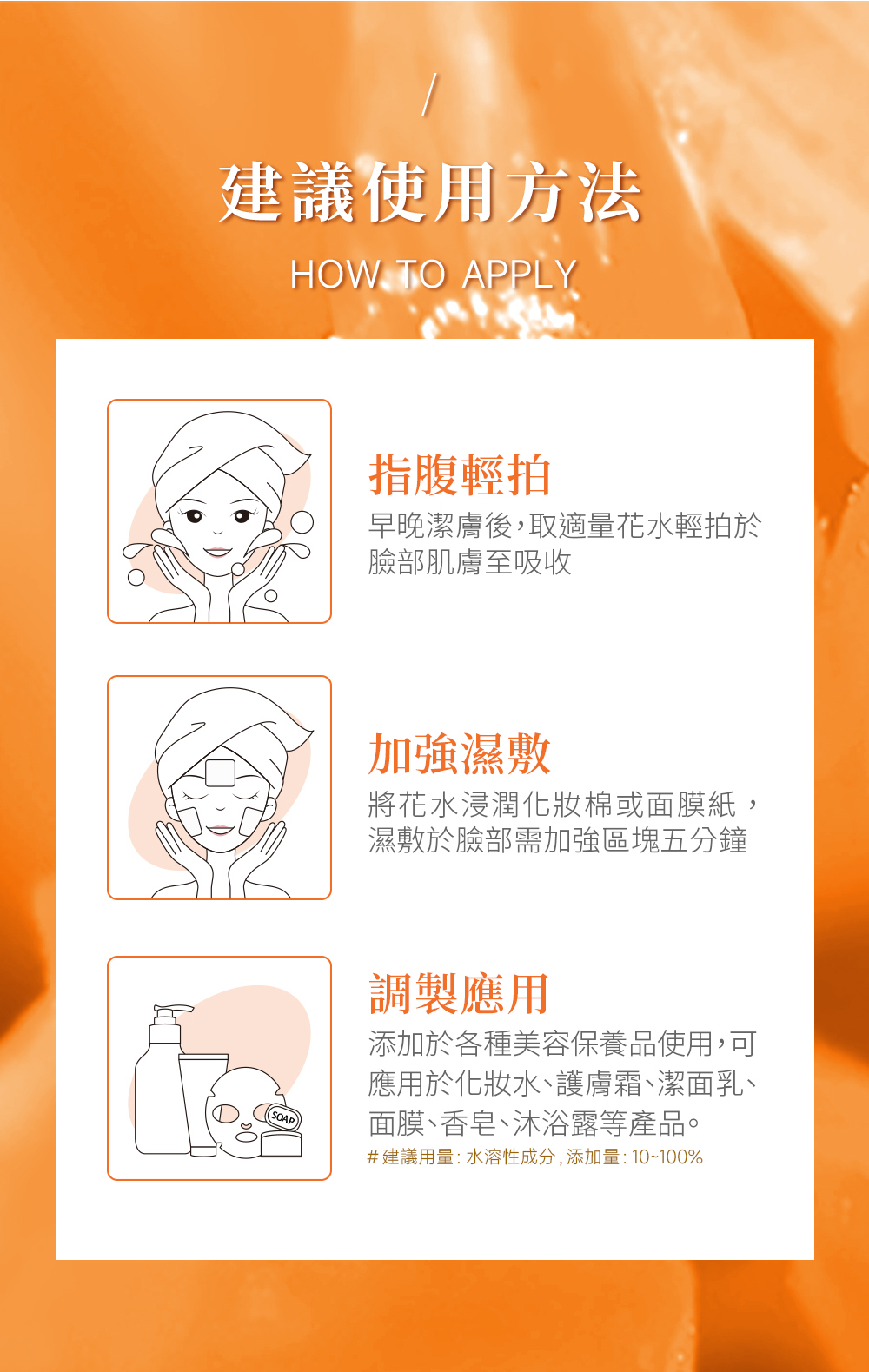 【化妝水|濕敷】每日早晚潔膚後,取適量輕拍塗抹於臉部肌膚至吸收,或使用面膜紙或化妝棉濕敷調理。