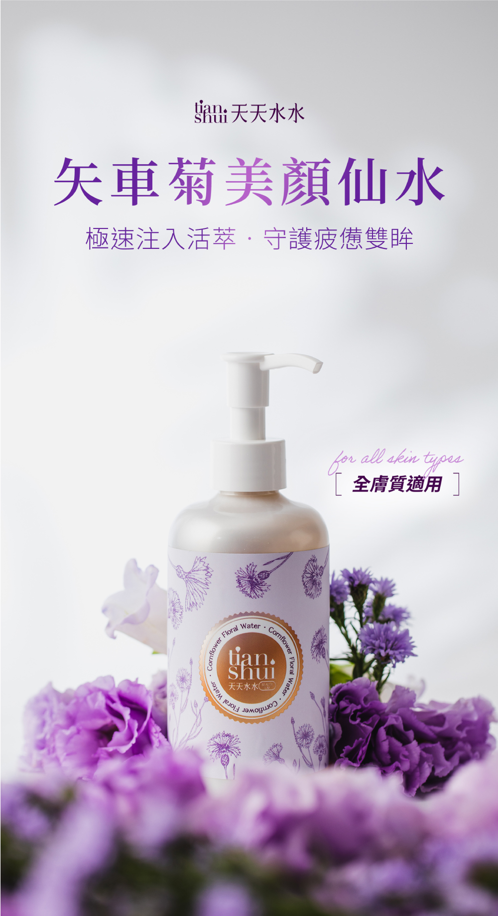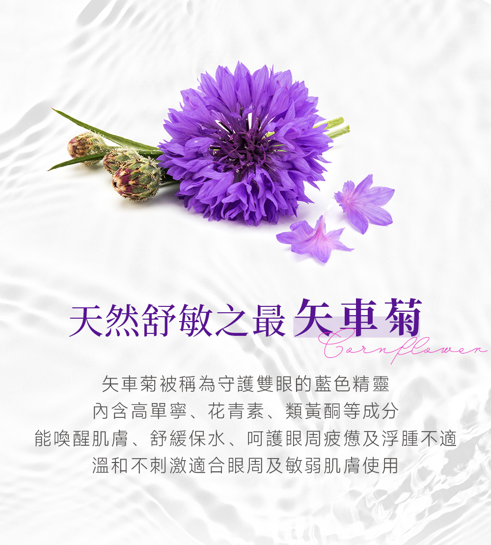 矢車菊美顏仙水(花水)的收斂作用有助於調節肌膚、平衡油脂分泌並增加膚色的光澤,其擁有的緊實肌膚及迅速補水功效,可撫平肌膚細紋並有助於舒緩眼周肌膚壓力。
