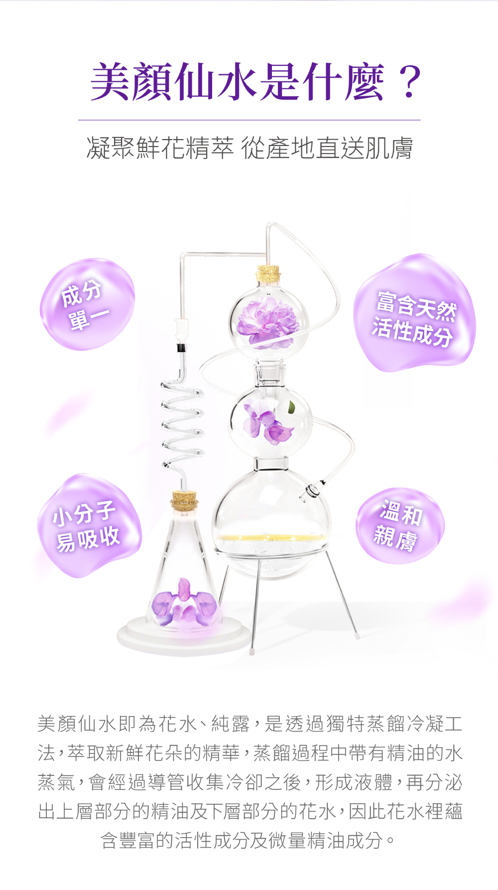 美顏仙水即為花水、純露,是透過獨特蒸餾冷凝工法,萃取新鮮花朵的精華,蒸餾過程中帶有精油的水蒸氣,會經過導管收集冷卻之後,形成液體,再分泌出上層部分的精油及下層部分的花水,因此花水裡蘊含豐富的活性成分及微量精油成分。