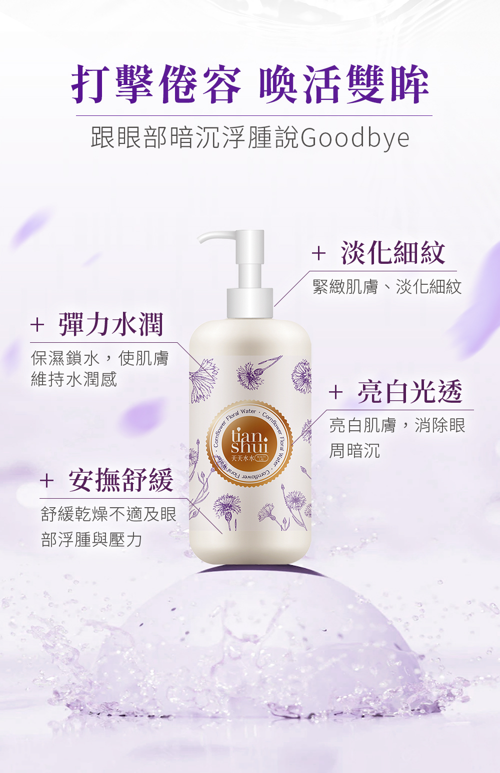【加強濕敷】將花水浸潤整張化妝棉或面膜紙,濕敷於臉部需加強區塊5分鐘;可濕敷於眼部肌膚,加強活化作用及提升後續眼霜效果。