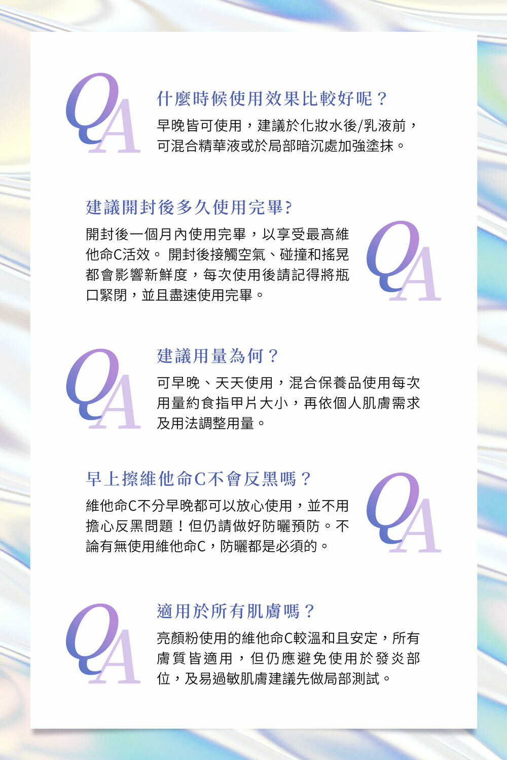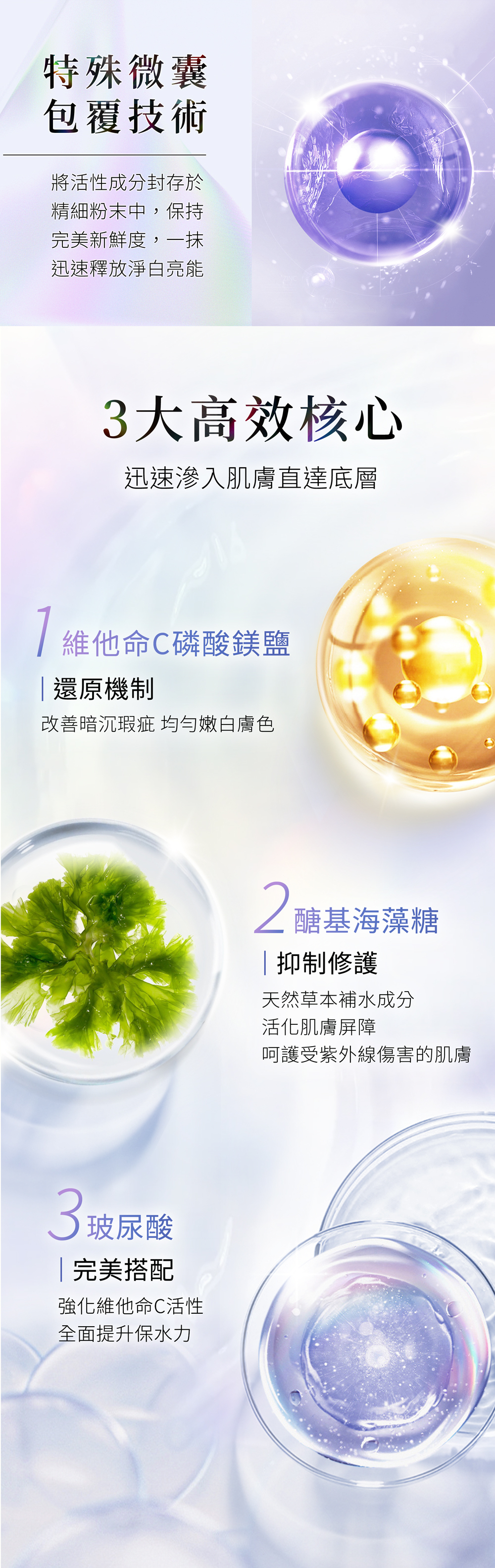 以微囊包覆技術,將淨白活性成分鎖入精細粉末中,輕柔按壓之際,解鎖微囊釋放淨白能量, 輔以高度水性保濕系統,將微C結合玻尿酸滲透吸收,有效均勻嫩白肌膚、改善暗沉,長期使用肌膚更能呈現晶瑩透皙光采。