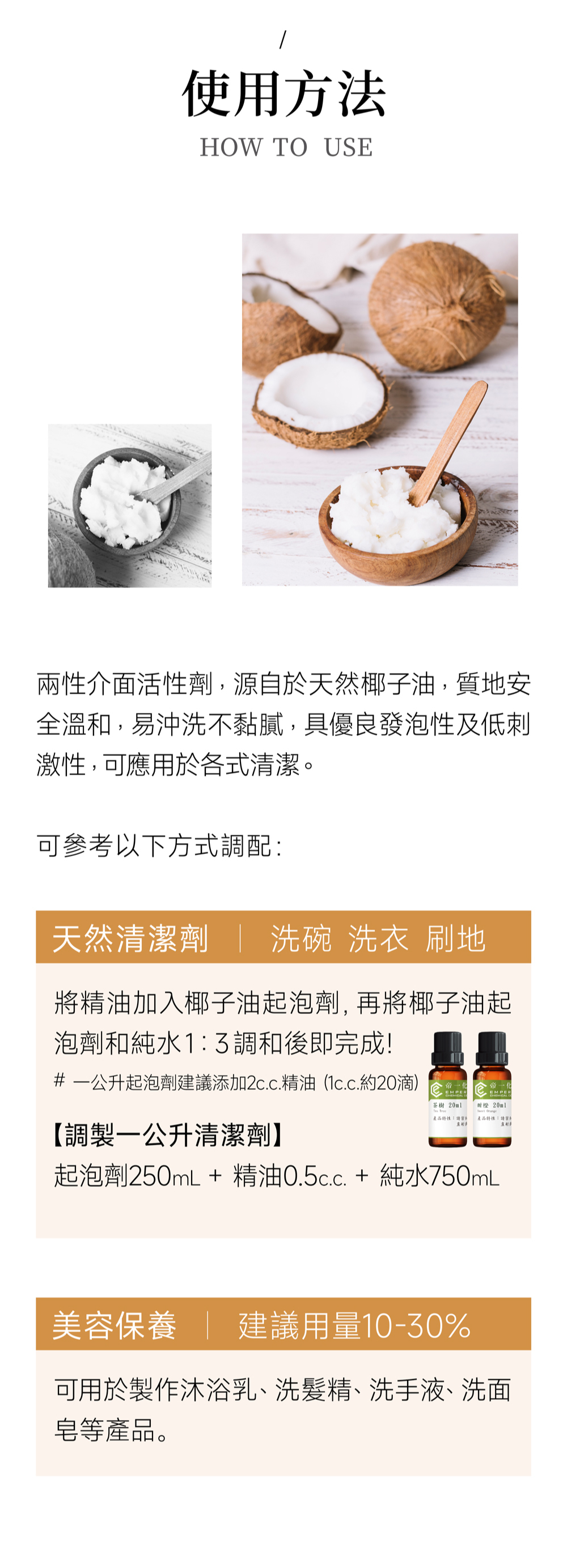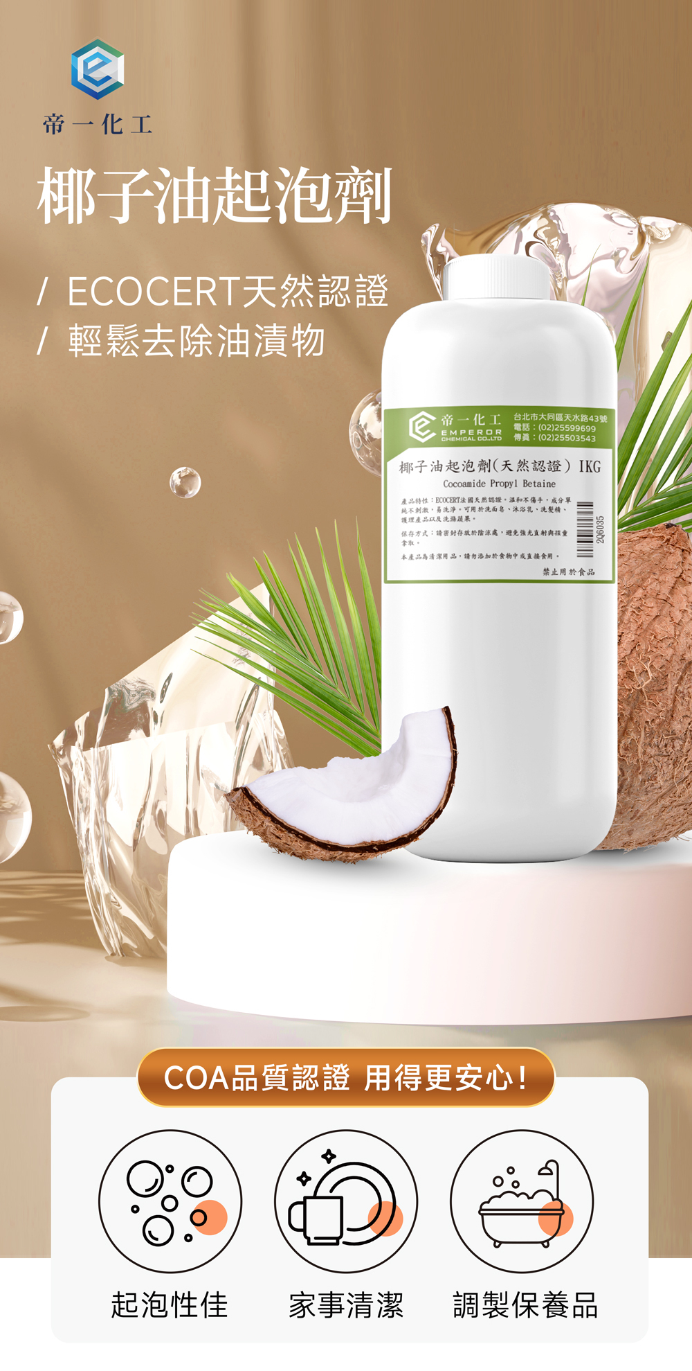 兩性界面活性劑,天然椰子油來源,安全溫和,洗後不殘留。具優良發泡性及低刺激性。可應用於各式清潔——洗碗精、刷地、洗衣,或用於調製沐浴乳、洗髮精、洗手液、洗面皂,是嬰兒護膚產品中的必備溫和成分。