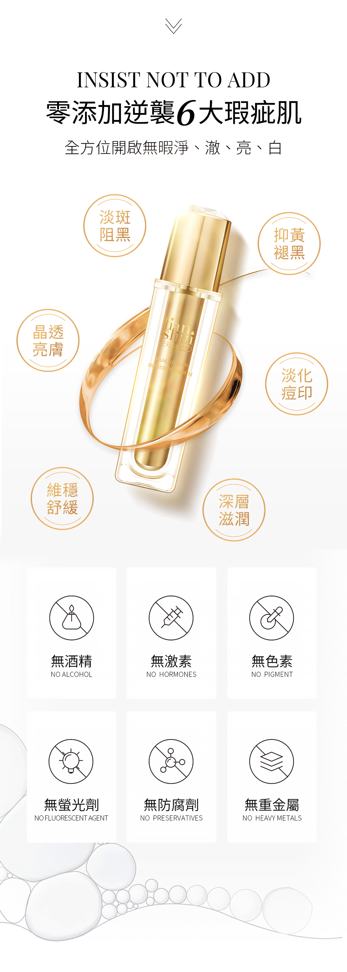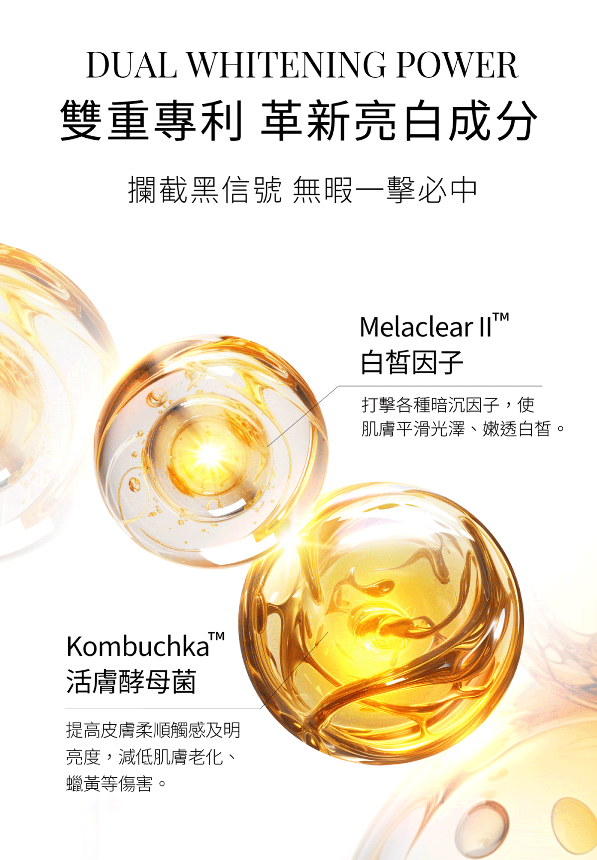 結合法國超完美專利配方「Melaclear II™白皙因子」、「Kombuchka™活膚酵母菌」,雙重淨白精華提亮肌膚同時維持柔順膚觸,有效打造肌膚透亮新境界,並以維生素B、E、C,加強修護均勻膚色,深入肌底擊退暗沉,自然綻放白皙無瑕感。