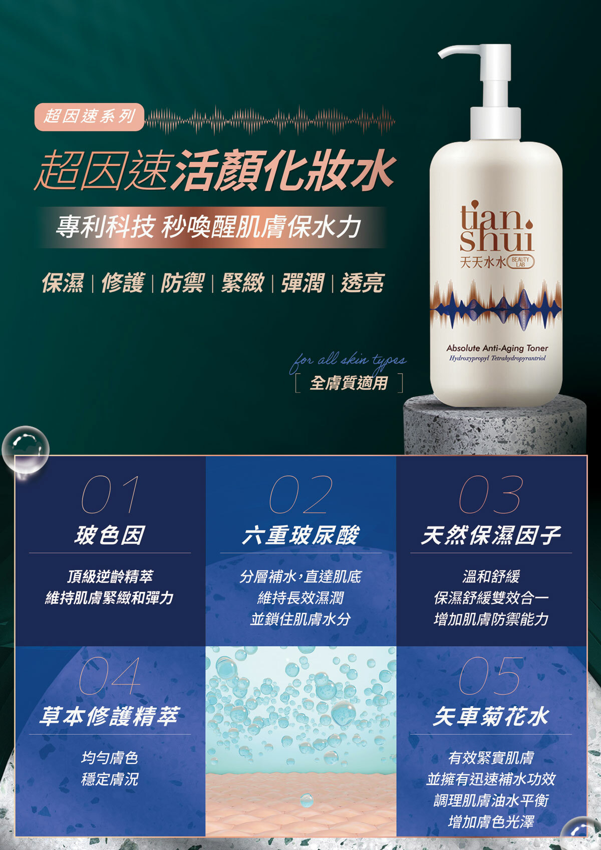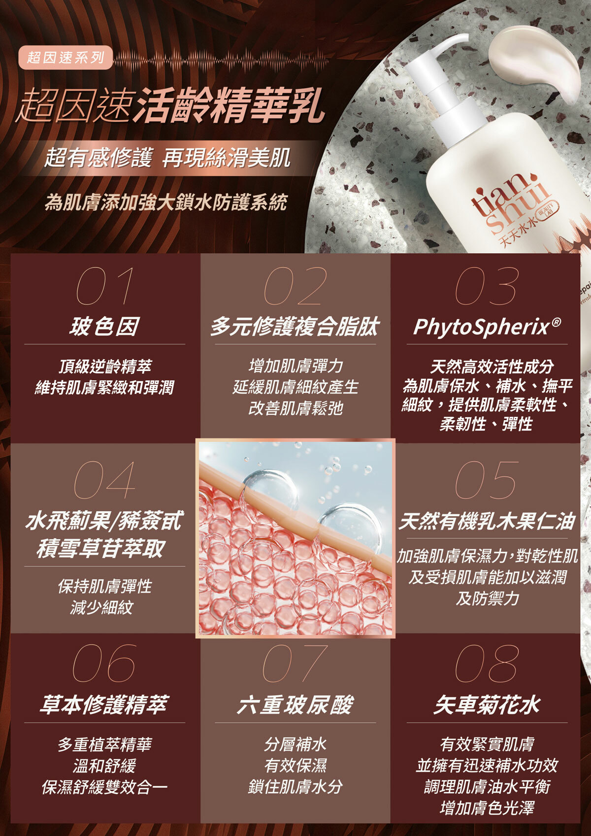 回購率第一的「超因速系列」超濃縮注入「玻色因」飽滿能量!搭配領先專利「六重玻尿酸」、「PhytoSpherix®」以及「多元修護複合脂肽」等頂級養護膚成分,不僅維持肌膚緊緻彈力,更建立強韌屏障,感受肌膚前所未有澎潤光感!